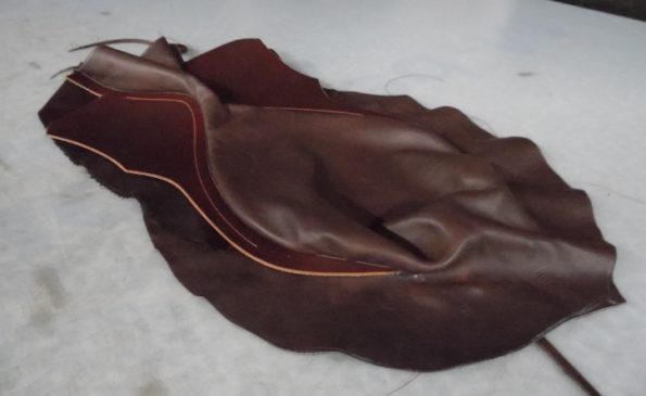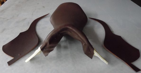Hier liegen die ausgeschnittenen kleinen Sattelblätter aus dem andersfarbigen, festeren Leder neben dem bezogenen Baum. (© C. Götz)