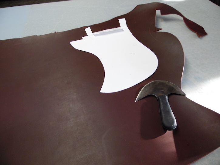 Die Sitzfläche ist bezogen, die Schablone für das kleine Sattelblatt, auch kleine Tasche genannt, wird überprüft. (© C. Götz)