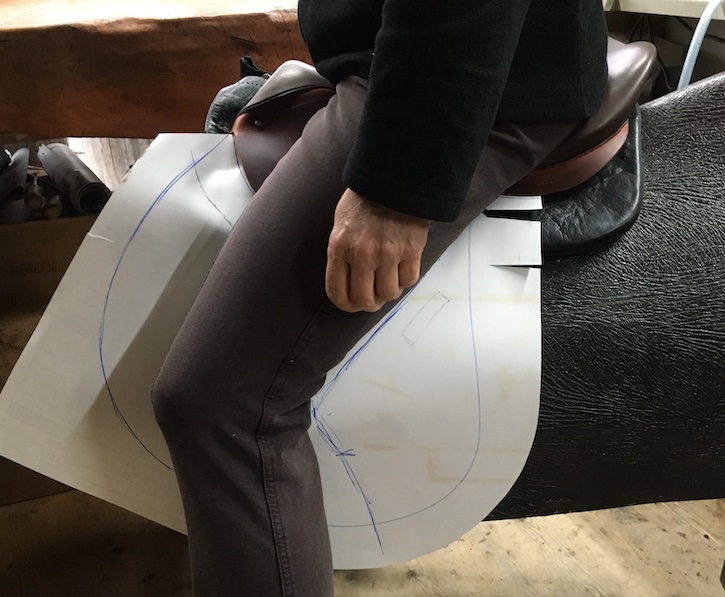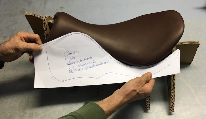 Das erste Mal im neuen Sattel – jedenfalls einem Teil davon – Platz genommen: Das große Sattelblatt wird final ausgemessen. (© C. Götz)