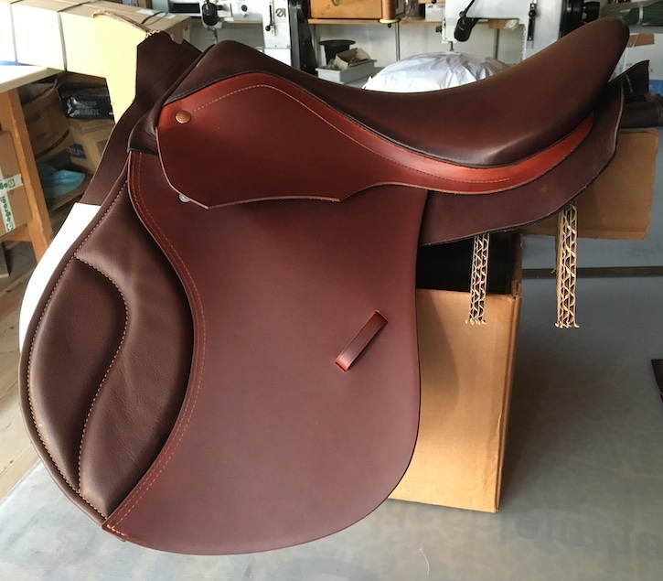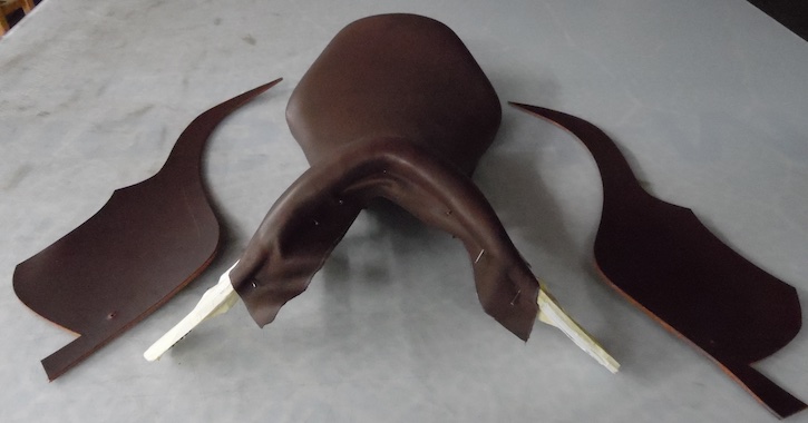 Hier liegen die ausgeschnittenen kleinen Sattelblätter aus dem andersfarbigen, festeren Leder neben dem bezogenen Baum. (© C. Götz)