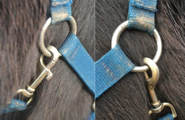 So oder so? Links die üblicherweise propagierte Verschnallung des dank sogenanntem Wirbel drehbaren Federkarabiners am Halfter, rechts die verpönte, die aber  leichter zu öffnen ist. Beide können Verletzungen verursachen. (© C. Götz)