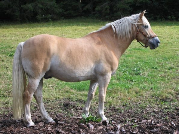 Eine sogenannte offene Aufstellung zeichnet sich dadurch aus, dass jeweils das der Kamera zugewandte Vorderbein nach vorne und das gleichseitige Hinterbein etwas nach hinten gestellt ist: Es sind vier Pferdebeine zu sehen. Für eine aussagekräftiges Bild bräuchte es hier jetzt noch planen Untergrund, saubere Hufe und bedeckten Himmel, damit der Schattenwurf die Ergebnisse nicht verfälscht. (© Flominator, Wikipedia)